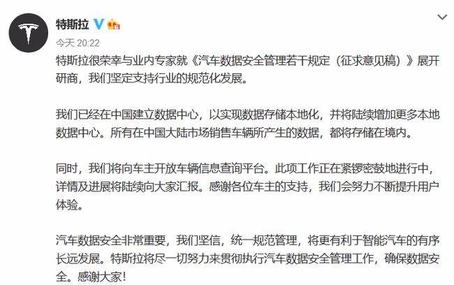 5月25日,特斯拉宣布已經(jīng)在中國建立了數(shù)據(jù)中心,將實(shí)現(xiàn)數(shù)據(jù)存儲(chǔ)本地化,并將陸續(xù)增加更多本地?cái)?shù)據(jù)中心。所有在國內(nèi)市場銷售的車輛所產(chǎn)生的數(shù)據(jù)都將存儲(chǔ)在境內(nèi)。
