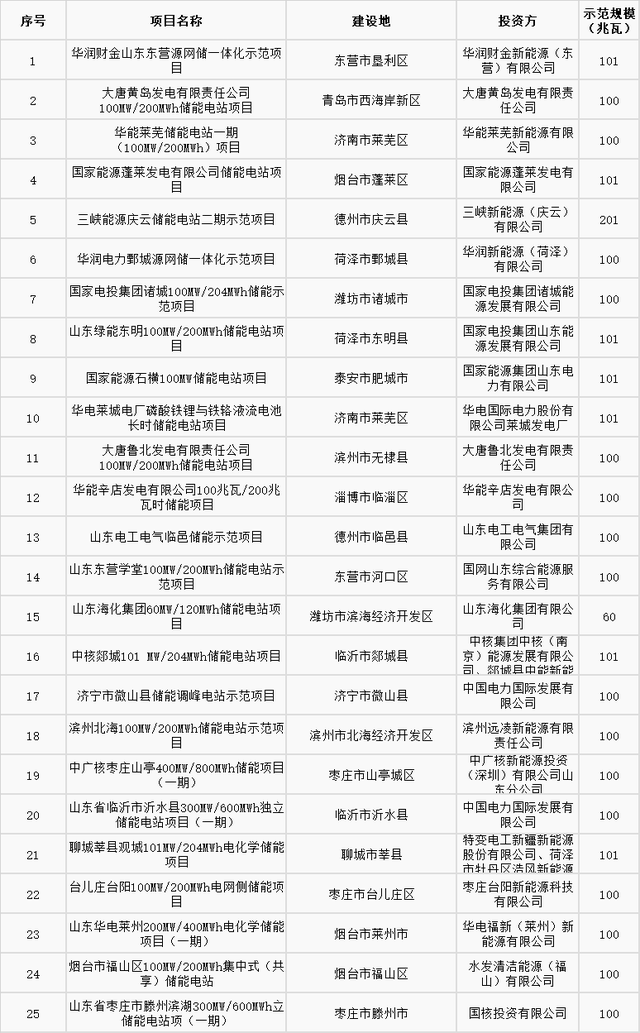 儲(chǔ)能在建設(shè)新型電力系統(tǒng)中具有重要地位,各地也紛紛布局儲(chǔ)能相關(guān)政策及示范項(xiàng)目,從而更好的推動(dòng)新型儲(chǔ)能建設(shè)的發(fā)展。4月7日,山東省能源局根據(jù)《關(guān)于開展2022年度儲(chǔ)能示范項(xiàng)目遴選工作的通知》精神,經(jīng)各市推薦和專家評(píng)審,擬將25個(gè)鋰電池類項(xiàng)目、4個(gè)新技術(shù)類項(xiàng)目列為2022年度儲(chǔ)能示范項(xiàng)目(具體名單見表格)。