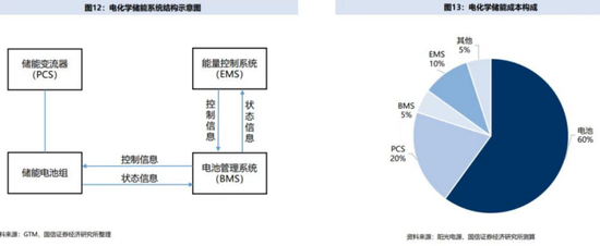 根據(jù)國信證券經(jīng)濟(jì)研究所測算,在電化學(xué)儲能系統(tǒng)的成本構(gòu)成中,電池占比約60%,儲能變流器PCS占比約20%。此外,能量控制系統(tǒng)占比約10%,電池管理系統(tǒng)占比5%左右。