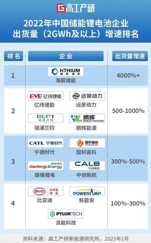 而從出貨量增速來看,2022年增速排名第一的為海辰儲(chǔ)能,達(dá)40倍以上。億緯鋰能、遠(yuǎn)景動(dòng)力、瑞浦蘭鈞、鵬輝能源排名第二檔,增速在5倍-10倍之間。寧德時(shí)代、國(guó)軒高科、贛鋒鋰電、中創(chuàng)新航位列第三檔,增速達(dá)3倍-5倍。比亞迪、派能科技、新能安出貨量增速達(dá)1倍-3倍。