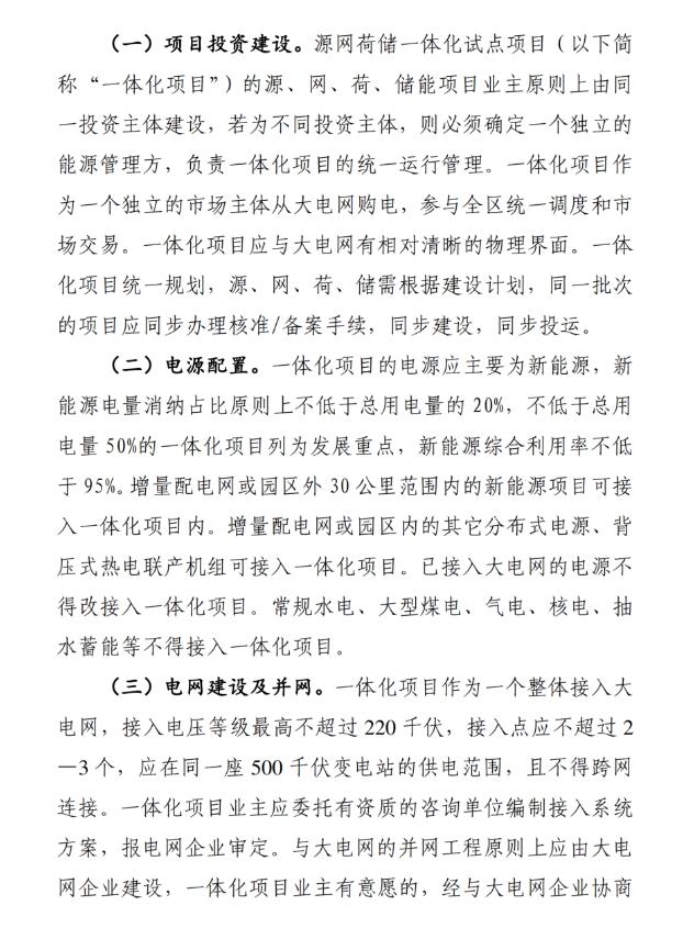 征求意見稿中關于園區(qū)(居民區(qū))級源網(wǎng)荷儲一體化試點要求中明確:一體化項目的電源配置為不低于總電量20%的新能源,其中不低于總用電量的50%的一體化項目列為重點發(fā)展,新能源綜合利用率不低于95%;儲能配置上要求不低于總裝機容量的15%、時長2小時,并能滿足削減一體化項目 5%高峰用電負荷的要求。