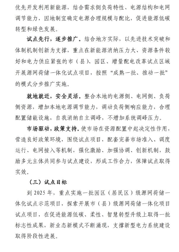 試點目標:到2025年,重點實施一批園區(qū)(居民區(qū))級源網(wǎng)荷儲一體化試點示范項目,探索開展市(縣)級源網(wǎng)荷儲一體化項目試點項目,在促進能源低碳、柔性、智慧轉型升級上取得一批標志性成果,新業(yè)態(tài)新模式不斷涌現(xiàn),支撐新型電力系統(tǒng)建設取得階段性進展。