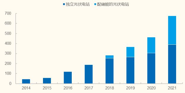 圖:2018年開始申請(qǐng)并網(wǎng)的光伏電站中光伏+儲(chǔ)能的占比顯著增加(GW)