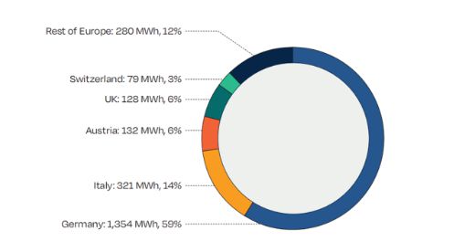 另外,當地家用電池安裝規(guī)模2020年為3GWh左右,2021年超過5GWh,今年已突破9GWh。2021年歐洲家用電池儲能市場增長了一倍多,達到2.3GWh,其中德國市場份額最大,占比達59%,新增儲能容量1.3GWh,年增長率為81%,意大利在2021年新增裝機321MWh,年增長率240%。