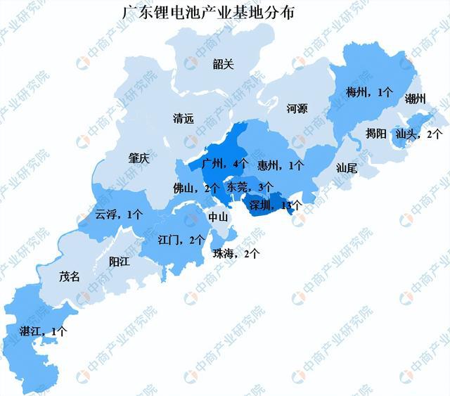 廣東是國內(nèi)重要的鋰電池基地,主要集中分布在珠三角地區(qū)。其中,深圳13個,廣州4個,東莞3個,佛山、江門、汕頭、珠海各2個,惠州、梅州、云浮、湛江各1個。