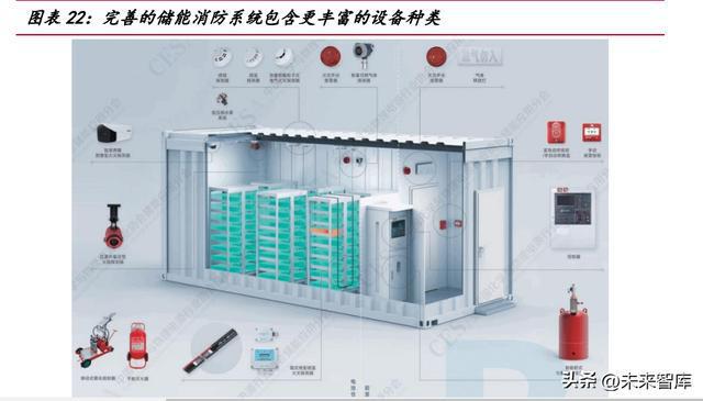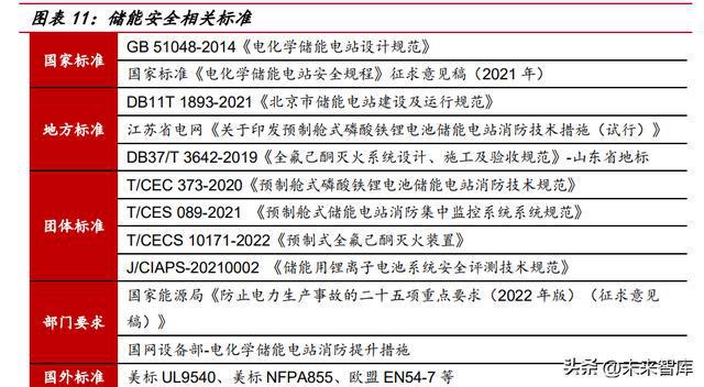 新標(biāo)準(zhǔn)對儲能安全標(biāo)準(zhǔn)提出更高要求。國家標(biāo)準(zhǔn) GB/T 42288-2022《電化學(xué)儲 能電站安全規(guī)程》已正式發(fā)布,將于 2023 年 7 月 1 日起正式實施。此前儲能安全領(lǐng) 域的老國標(biāo)系 2014 年發(fā)布,在消防領(lǐng)域主要規(guī)范了建筑物和設(shè)備防火等級、消防水 池和砂池的配置,探測和預(yù)警方面提出“應(yīng)設(shè)置火災(zāi)自動報警系統(tǒng)”和“宜配置感煙 探測器和可燃?xì)怏w報警裝置”。2021 年出臺的新國標(biāo)征求意見稿,開始引入“自動滅 火系統(tǒng)”、“電池模塊級消防”、“多系統(tǒng)聯(lián)動”、“抑制復(fù)燃”等概念。此次新國標(biāo)正式 發(fā)布,相較征求意見稿進(jìn)一步趨嚴(yán),新增了“每個電池模塊可單獨配置探測器”的表 述;“且防止復(fù)燃”的表述升級為“持續(xù)抑制復(fù)燃”。