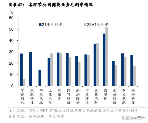 各環(huán)節(jié) 22H1 毛利率相比 21 年全年普遍走低,消防環(huán)節(jié)毛利率水平最高。21 年電芯環(huán)節(jié) 兩家企業(yè)儲(chǔ)能業(yè)務(wù)毛利率處于 28%-30%,22H1 受到上游鋰礦價(jià)格高漲且傳導(dǎo)滯后影響, 盈利空間被顯著壓縮,以寧德時(shí)代為例,22H1 毛利率下滑至 6.43%。消防環(huán)節(jié)毛利率最高, 且兩家公司 22H1 毛利率相比 21 年均有提升,我們認(rèn)為主要系公司產(chǎn)品結(jié)構(gòu)優(yōu)化致整體毛 利率水平抬升。儲(chǔ)能 PCS 及系統(tǒng)集成環(huán)節(jié)內(nèi)各公司由于業(yè)務(wù)結(jié)構(gòu)及出貨市場(chǎng)的不同毛利率 水平差異較大,陽(yáng)光電源/上能電氣 2021 年儲(chǔ)能業(yè)務(wù)毛利率水平分別為 14.11% /24.52%。 溫控環(huán)節(jié)毛利率普遍在 25%-30%之間。EPC 環(huán)節(jié) 21 年毛利率普遍在 20%-30%之間,22H1 毛利率水平出現(xiàn)明顯下滑。