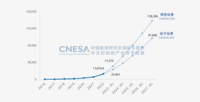 CNESA自2014年起對(duì)中國儲(chǔ)能市場規(guī)模進(jìn)行預(yù)測,本版白皮書中,CNESA基于保守場景(定義為政策執(zhí)行、成本下降、技術(shù)改進(jìn)等因素未達(dá)預(yù)期的情形)和理想場景(定義為各省儲(chǔ)能規(guī)劃目標(biāo)順利實(shí)現(xiàn)的情形)對(duì)2023-2027年中國新型儲(chǔ)能市場的規(guī)模和發(fā)展趨勢進(jìn)行預(yù)測。