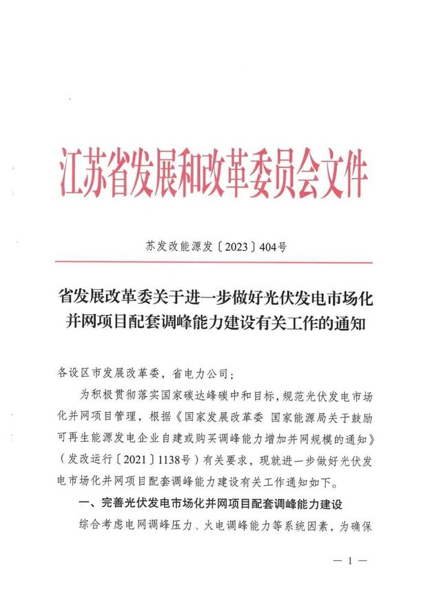 4月17日,江蘇省發(fā)展改革委發(fā)布《關于進一步做好光伏發(fā)電市場化并網項目配套調峰能力建設有關工作的通知》(文件原文附后),文件提出: