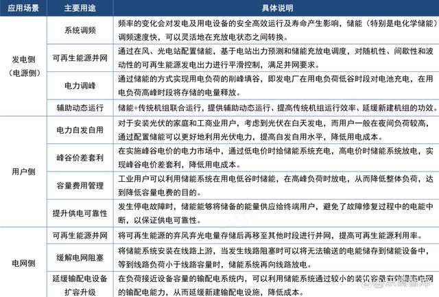 發(fā)電側可用于系統(tǒng)調頻、可再生能源并網、電力調峰、輔助動態(tài)運行等;在用戶側主要用于電力自發(fā)自用、峰谷價差套利、容量電費管理和提升供電可靠性等;在電網側主要用于可再生能源并網、緩解電網阻塞、延緩輸配電設備擴容升級等。