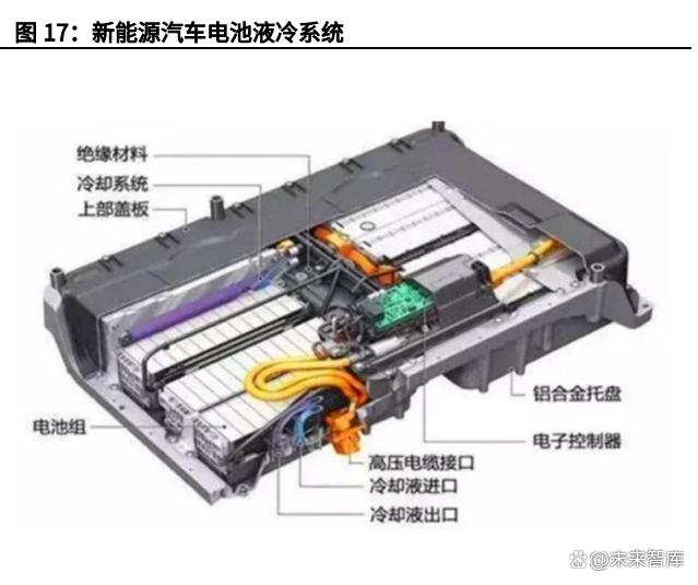 液冷系統(tǒng)的核心是液冷板和定制化流道設(shè)計。液冷系統(tǒng)一般由液冷板、液冷 機組(加熱器選配)、液冷管路、高低壓線束、冷卻液等組成。其中,液冷板的 結(jié)構(gòu)直接影響換熱效果,是最關(guān)鍵的零部件之一。同時,為避免電池包溫度分 布不均勻,需控制不同流道內(nèi)的流量分布保持均勻,在一定范圍內(nèi)增加流速會 提升散熱效率,但當達到一定值時會使管路內(nèi)壓降增大,增大能耗,因此需要 結(jié)合實際情況進行定制化流道設(shè)計。目前這一領(lǐng)域的代表企業(yè)有英維克、同飛 股份、奧特佳等。