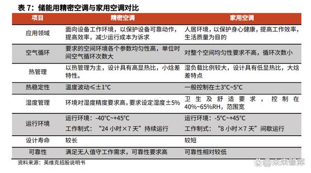 風(fēng)冷是當前主流儲能方案,技術(shù)難點在于風(fēng)道設(shè)計和空調(diào)控制。不同儲能系 統(tǒng)內(nèi)電池的散熱量及擺放位置不同,為保持系統(tǒng)內(nèi)部溫差較小,需要對其內(nèi)部 的風(fēng)道進行定制化設(shè)計。相較于家用空調(diào),儲能溫控系統(tǒng)中使用的精密空調(diào)具 有溫濕度控制精度高、壽命長等特點,技術(shù)壁壘較高,家用空調(diào)企業(yè)跨界存在 較大難度,目前這一領(lǐng)域的代表性企業(yè)有英維克、申菱環(huán)境等。