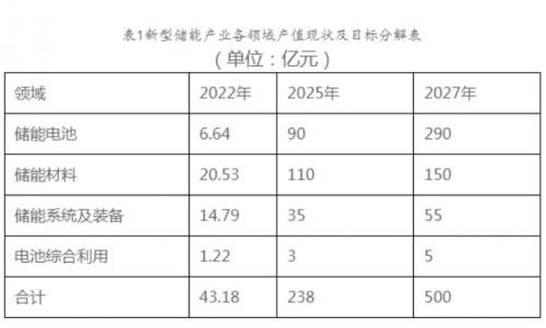 文件明確,到2027年,新型儲能產(chǎn)業(yè)產(chǎn)值規(guī)模超500億元,儲能電池產(chǎn)能達(dá)40GWh,新型儲能電站裝機規(guī)模達(dá)260萬千瓦以上。力爭培育產(chǎn)值超過100億元企業(yè)1家以上,超50億元企業(yè)5家以上,超10億元企業(yè)10家以上。