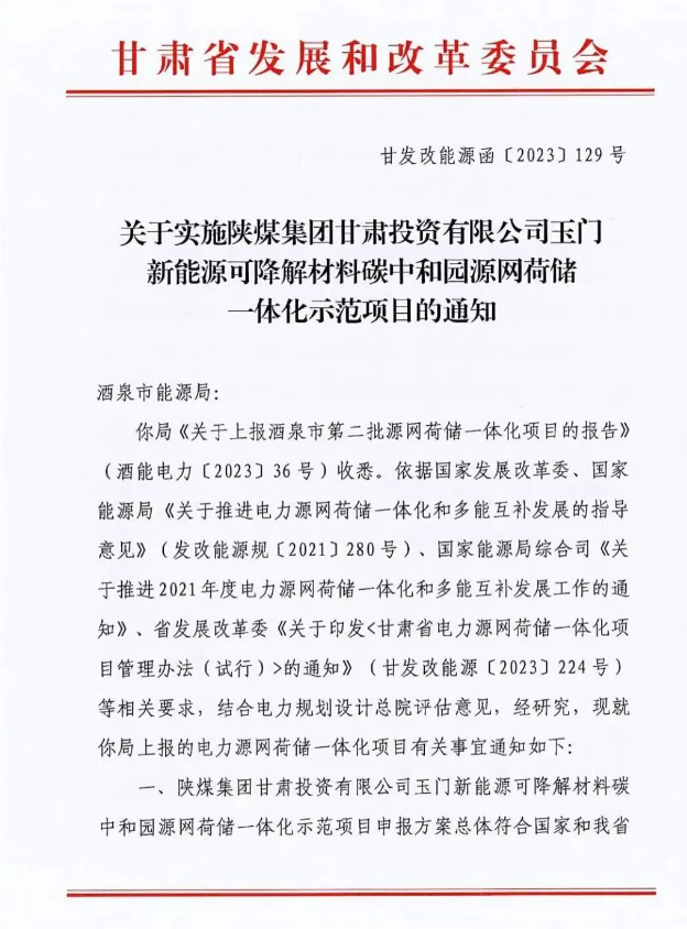 近日,從甘肅省發(fā)改委傳來喜訊,由陜煤集團(tuán)甘肅投資有限公司(以下簡稱:甘肅投資公司)申報的“玉門新能源可降解材料碳中和產(chǎn)業(yè)園源網(wǎng)荷儲一體化項(xiàng)目”獲批,標(biāo)志著全國最大、陜煤集團(tuán)“十四五”發(fā)展規(guī)劃首批、甘肅投資公司首個源網(wǎng)荷儲一體化項(xiàng)目正式落地。