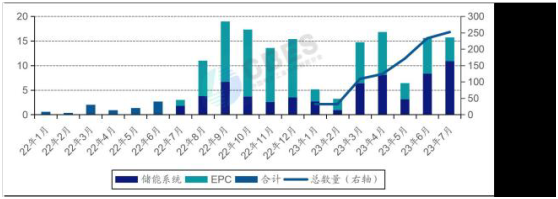 中國電池工業(yè)協(xié)會(huì)儲(chǔ)能分會(huì)近日發(fā)布的2023中國新型儲(chǔ)能7月研究簡報(bào)顯示,儲(chǔ)能市場持續(xù)火熱,7 月儲(chǔ)能系統(tǒng)招標(biāo)規(guī)模創(chuàng)歷史新高。分會(huì)共統(tǒng)計(jì)到儲(chǔ)能招標(biāo)項(xiàng)目252個(gè),總規(guī)模達(dá)到15.8GWh ,環(huán)比增長1% ,同比增長425% 。其中,儲(chǔ)能EPC項(xiàng)目共計(jì)171個(gè),規(guī)模為4.9GWh ,儲(chǔ)能系統(tǒng)項(xiàng)目共計(jì)81個(gè),規(guī)模為10.9GWh。