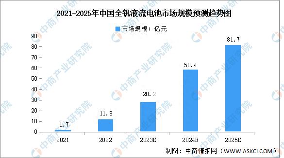 全釩液流電池的市場空間主要來自于儲能需求的增長以及自身滲透率的提升,隨著技術(shù)的進步及生產(chǎn)成本的降低,全釩液流電池市場空間將逐步擴大。數(shù)據(jù)顯示,2022年全釩液流電池市場規(guī)模約11.8億元,中商產(chǎn)業(yè)研究院分析師預測,2023年我國全釩液流電池市場規(guī)模將達28.2億元,預計2025年將增至81.7億元,2021-2025年復合年均增長率達163.3%。