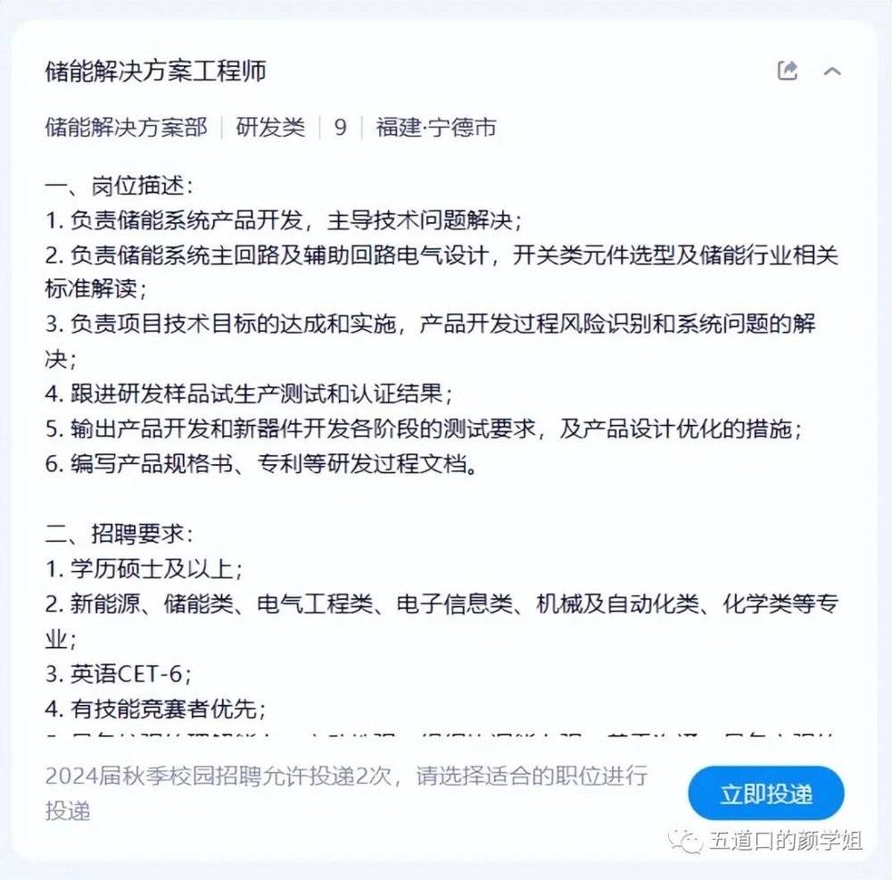 寧德時(shí)代的儲(chǔ)能方案工程師的招聘要求是:新能源、儲(chǔ)能類、電氣工程類、機(jī)械類、電子信息類、化學(xué)類。