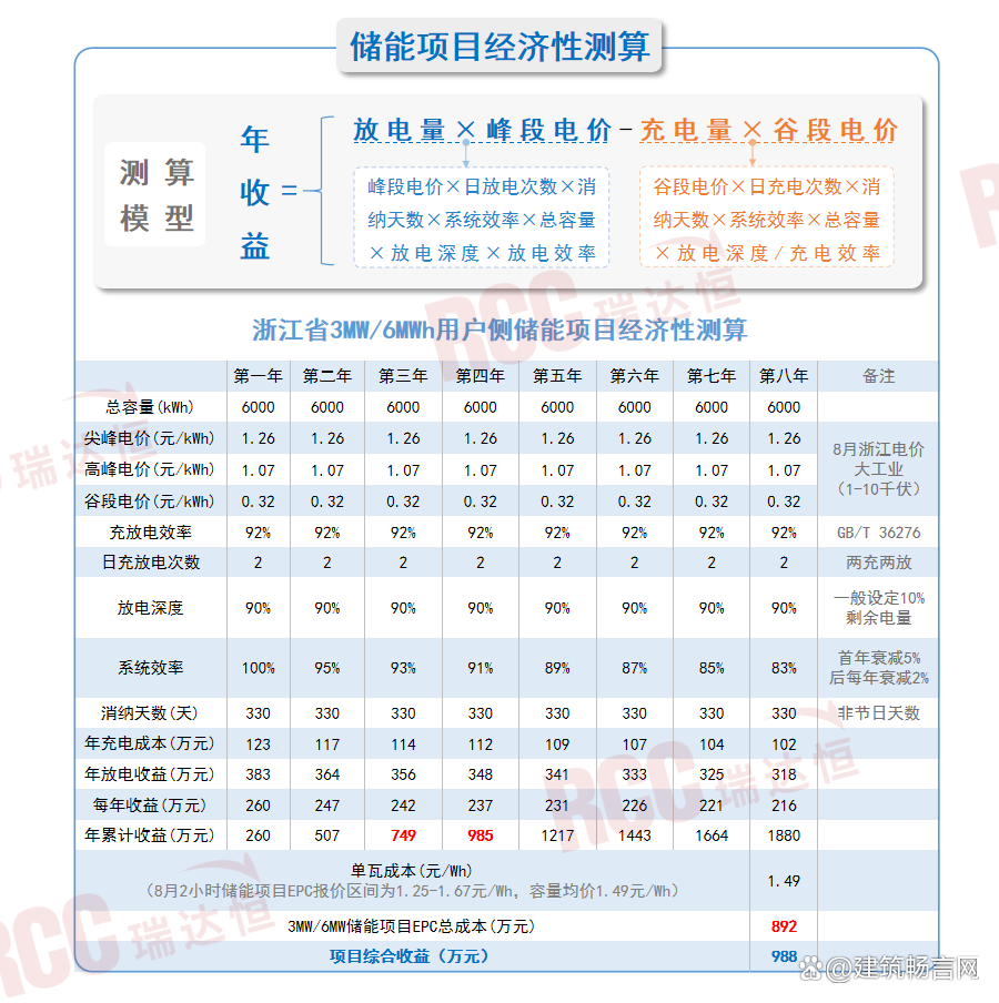 RCC瑞達恒研究院基于8月份的電價及儲能項目EPC中標均價等數(shù)據(jù),以浙江省某化纖生產(chǎn)公司3MW/6MW的用戶側(cè)儲能項目為例進行經(jīng)濟性測算得出:該項目約3.5年便可回收項目建設成本,按項目運行周期8年測算,項目可為業(yè)主節(jié)省988萬元的電費。