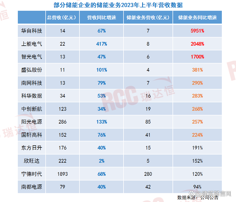 儲能企業(yè)陸續(xù)公布2023年上半年業(yè)績,近7成實現(xiàn)營收正增長,部分企業(yè)迎來儲能業(yè)績大爆發(fā)。華自科技、上能電氣、智光電氣儲能業(yè)務營收分別同比增長5951%、2048%、1700%。