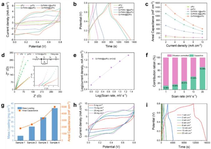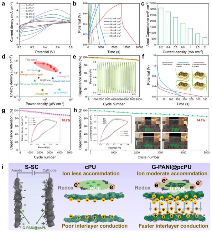 根據(jù)恒流充放電(GCD)曲線計算得出G-PANI@pcPU的最高面積比電容為1,512.5 mF cm−2(圖4c)。提高G-PANI在電極上負(fù)載量能有效提高電極的能量存儲,面積比電容可達到5,093.7 mF cm−2(圖4g-i)。