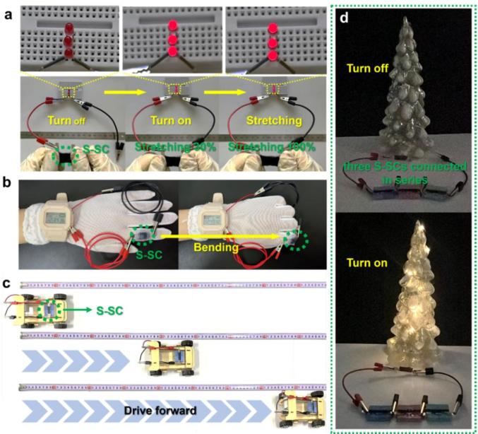 綜上所述,G-PANI@pcPU電極具有相互連接的多孔骨架、開放的離子遷移/插層通道、高機械柔性和大規(guī)模制備等優(yōu)勢。在三電極系統(tǒng)中表現(xiàn)出超大的面積電容與贗電容可調(diào)性能。構(gòu)筑的G-PANI@pcPU可拉伸超級電容器(S-SCs)具有高能量密度、大比電容和優(yōu)異的可拉伸循環(huán)穩(wěn)定性,并實現(xiàn)了在高拉伸形變條件下為電子器件穩(wěn)定供電的應(yīng)用。