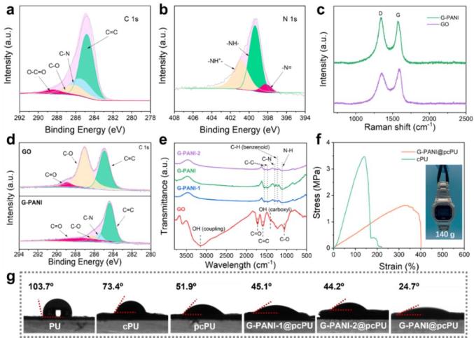 從圖3(a-e)的X射線光電子能譜、拉曼光譜和紅外光譜分析可以看出,苯胺成功還原GO生成G-PANI (圖3a-e)。G-PANI@pcPU的抗拉強度為1.61?MPa,斷裂伸長率為401% (圖3f)。