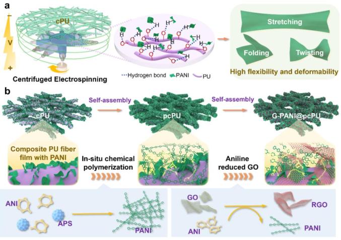 首先,將聚氨酯(PU)和PANI溶液的良好分散體紡成具有優(yōu)異柔韌性和可變形性的復(fù)合PU(cPU)織物。PU和PANI之間的強氫鍵增加了PANI鏈和PU基體的混溶性和混合均勻性,為后續(xù)PANI誘導(dǎo)的自組裝反應(yīng)提供了豐富的活性位點。