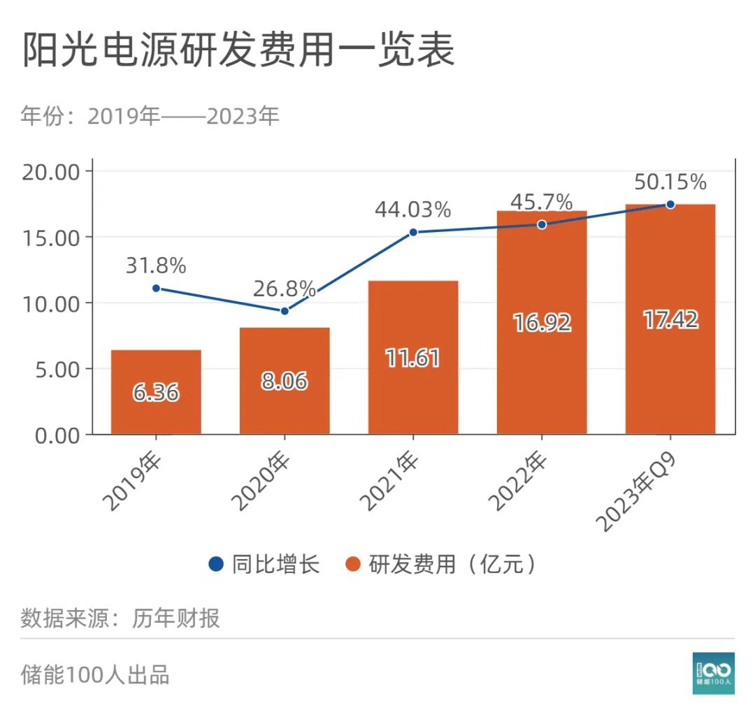事實(shí)上,陽光電源自1997年成立起,26年來一直不斷加大科研投入,時刻不忘技術(shù)創(chuàng)新。截至目前,其在合肥、上海、南京、深圳、德國、荷蘭有六大研發(fā)中心,研發(fā)人員占比40%,2023年前三季度研發(fā)費(fèi)用投入17.42億元。申請專利5300余項(xiàng),持有數(shù)業(yè)內(nèi)第一。