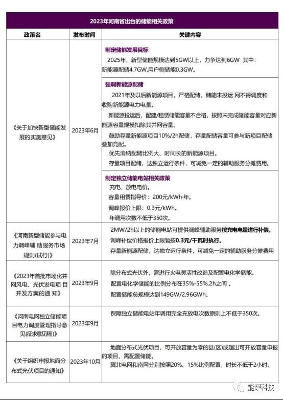 為推動河南儲能項目的開展,2023年,河南省密集出臺多項政策推動儲能發(fā)展,涉及電力調(diào)峰輔助服務、新能源配儲、獨立儲能容量租賃及調(diào)用次數(shù)等多方面。