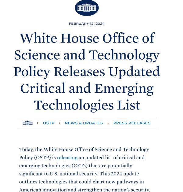 2024年2月,美國國家科學技術委員會(NSTC)發(fā)布了新一版關鍵和新興技術(Critical and emerging technologies, CETs)清單。CETs清單以美國2020年發(fā)布的《關鍵和新興技術國家戰(zhàn)略》為基礎,每兩年更新一次關鍵和新興技術領域列表,及各領域內的具體技術清單。