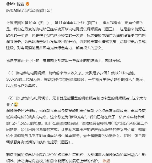 近日,智車派注意到,蔚來副總裁沈斐在微博發(fā)文稱,在丹麥的換電站已經(jīng)成功開始向電網(wǎng)提供調(diào)頻服務(wù),這是蔚來能源在歐洲的一小步,也是整個(gè)換電商業(yè)模式的一大步,標(biāo)志著換電站作為儲能設(shè)備參與電網(wǎng)調(diào)頻服務(wù)。沈斐表示,期待中國的換電站也能以聚合的虛擬電廠等形式,大規(guī)模進(jìn)入調(diào)峰調(diào)頻的車網(wǎng)融合互動領(lǐng)域。