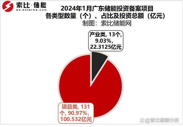 據(jù)索比儲能網(wǎng)不完全統(tǒng)計(jì),2024年1月,廣東省儲能投資備案項(xiàng)目144個,總投資金額達(dá)122.8444995億元。其中產(chǎn)業(yè)類項(xiàng)目13個,投資額22.3125億元;項(xiàng)目類131個,規(guī)模為2723.523MW/ 5727.044MWh,投資金額100.5319995億元。