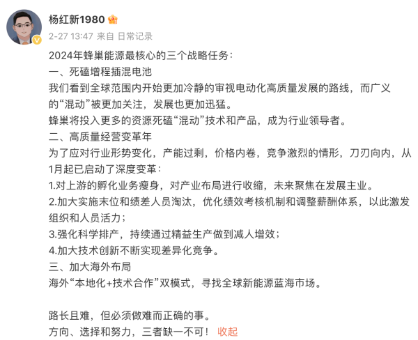 在這條微博中,楊紅新指出了2024年蜂巢能源最核心的三個(gè)戰(zhàn)略任務(wù),除了上述“高質(zhì)量經(jīng)營變革”的任務(wù),還包括死磕增程插混電池、加大海外布局兩項(xiàng)。