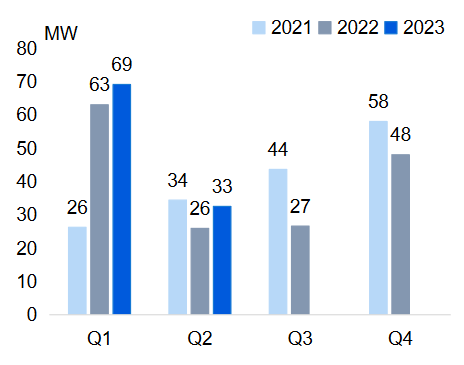 圖:2021-2023美國工商儲(chǔ)市場(chǎng)裝機(jī)(MW)