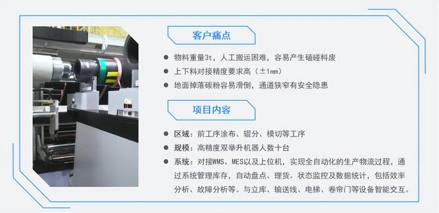 在某儲(chǔ)能頭部企業(yè)實(shí)現(xiàn)產(chǎn)線物流無(wú)人化的項(xiàng)目中,磅旗無(wú)人工場(chǎng)數(shù)字化方案籠罩前段與中段產(chǎn)線物流全過(guò)程,包含涂布上下料、極卷緩存搬運(yùn)、輥壓分切上料、輥壓分切下料、模切上下料、卷繞上料、隔閡運(yùn)輸、空卷筒回流運(yùn)輸?shù)裙に囘^(guò)程。實(shí)現(xiàn)全過(guò)程主動(dòng)化、無(wú)人化、物料多級(jí)智能拉動(dòng)、上下工序智能協(xié)同。