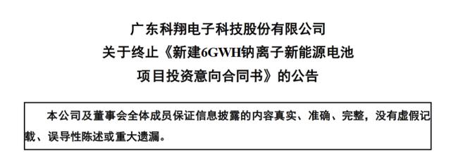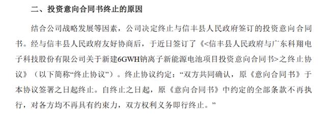 據(jù)科翔股份董秘辦的工作人員回應(yīng)稱,這是公司根據(jù)發(fā)展情況做出的決定,也表示公司還在繼續(xù)做鈉離子電池,后續(xù)應(yīng)該會披露進(jìn)展。信豐縣的終止項目是意向協(xié)議,而與大亞灣簽訂的是正式協(xié)議。