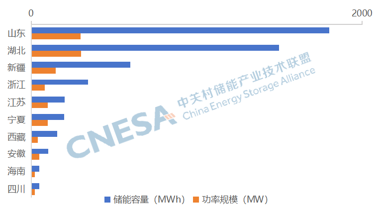 從區(qū)域分布上看,新型儲能投運項目主要分布在山東、湖北、新疆、浙江、江蘇等15個省市自治區(qū),其中湖北、山東、新疆、江蘇、寧夏新增投運規(guī)模在百兆瓦級。湖北、山東各有一個300MW級壓縮空氣儲能項目首次并網(wǎng)發(fā)電一次成功,分別位居功率規(guī)模和能量規(guī)模首位。