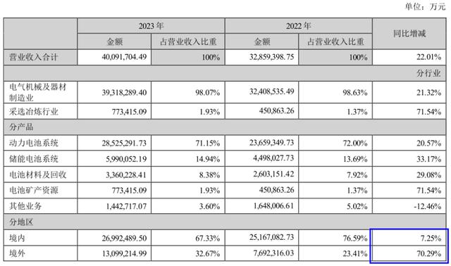 從銷(xiāo)售區(qū)域來(lái)看,海外市場(chǎng)已經(jīng)成為推動(dòng)寧德時(shí)代營(yíng)收增長(zhǎng)的關(guān)鍵。據(jù)公司年報(bào)數(shù)據(jù)顯示,2023年全年,寧德時(shí)代境外市場(chǎng)實(shí)現(xiàn)銷(xiāo)售收入1309.92億元,同比增長(zhǎng)70.29%,收入占比為32.67%,同比提升了9.16個(gè)百分點(diǎn),毛利率為25.19%。對(duì)比看,公司境內(nèi)市場(chǎng)銷(xiāo)售收入為2699.25億元,同比增長(zhǎng)7.25%,銷(xiāo)售毛利率為21.8%。