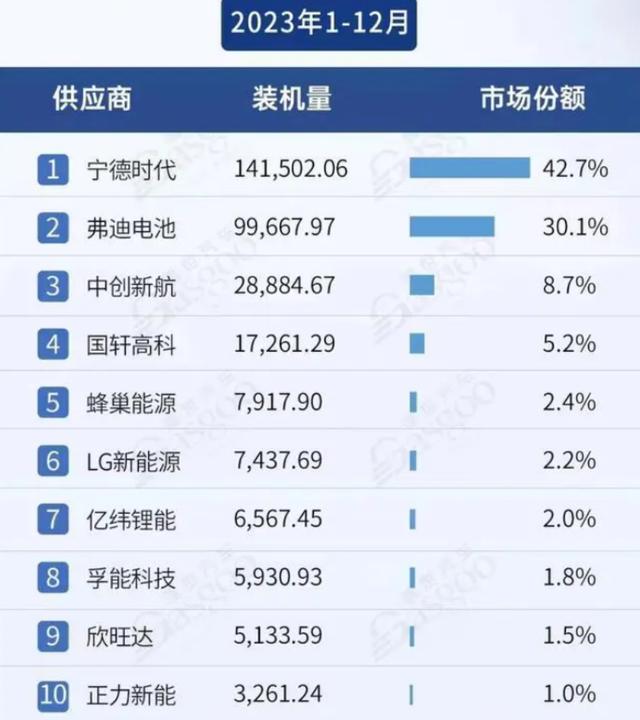 相比高速增長(zhǎng)的海外市場(chǎng),寧德時(shí)代國(guó)內(nèi)市場(chǎng)表現(xiàn)稍為遜色,2023年同比增速僅為7.2%。這其中,一方面是因?yàn)閷幍聲r(shí)代國(guó)內(nèi)市場(chǎng)市占率早就達(dá)到50%的高位,另一方面則是源于以比亞迪為核心的同行所帶來(lái)的競(jìng)爭(zhēng)壓力。