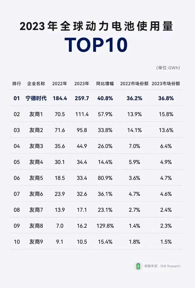 事實(shí)上,寧德時(shí)代評(píng)級(jí)之所以能夠獲得上調(diào),與其市場(chǎng)份額的持續(xù)提升不無(wú)關(guān)系?!?023年全球動(dòng)力電池使用數(shù)據(jù)》顯示,2023年寧德時(shí)代動(dòng)力電池使用量達(dá)259.7GWh,相較2022年增長(zhǎng)40.8%,市場(chǎng)占有率高達(dá)36.8%,穩(wěn)居世界第一,比第二名高出近21個(gè)百分點(diǎn)。