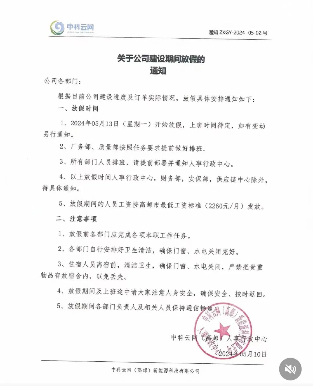 《放假通知》則指出,根據(jù)公司的建設進度及訂單實際情況,除了人事行政中心、財務部、安保部和供應鏈中心外,公司于5月13日開始放假,上班時間待定。放假期間的人員工資按照高郵市最低工資標準(2260元/ 月)發(fā)放。
