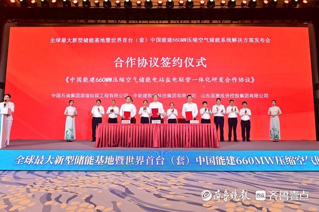 會上,中國能建數(shù)科集團發(fā)布《世界首臺(套)中國能建660MW壓縮空氣儲能系統(tǒng)解決方案》,并介紹了中國能建在山東省建設(shè)3060MW儲能基地的規(guī)劃布局及賦能“西電東送”新圖景。山東國惠投資控股集團有限公司、中國石油集團渤海鉆探工程有限公司、陜西鼓風(fēng)機(集團)有限公司、上海電氣電站集團等項目合作企業(yè),與中國能建數(shù)科集團共同簽訂了《中國能建660MW壓縮空氣儲能系統(tǒng)核心裝備技術(shù)方案研發(fā)合作協(xié)議》等三項合作協(xié)議,標志著圍繞壓縮空氣儲能的又一“政企合作、央地共建”典范項目正式吹響集結(jié)號。