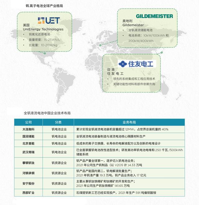2022 年全釩液流電池整個行業(yè)還處于商業(yè)化進(jìn)程緩慢階段,全球范圍內(nèi)只有日本住友電工、美國 UniEnergyTechnologies、奧地利 Gildemeister 和中國大連融科能提供成熟的商業(yè)化產(chǎn)品。2023年,隨著我國在長時儲能、價格補(bǔ)償、鼓勵釩資源開發(fā)等支持政策的落地生效以及資本市場的追捧,全釩液流電池賽道創(chuàng)新企業(yè)涌現(xiàn),推動我國全釩液流儲能技術(shù)和產(chǎn)業(yè)發(fā)展向世界領(lǐng)先水平邁進(jìn)。