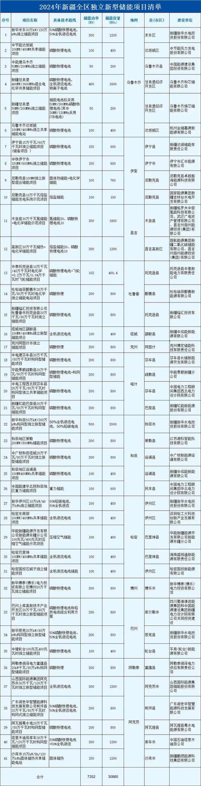 清單顯示,總共41個(gè)項(xiàng)目,總規(guī)模達(dá)7.35GW/30.86GWh。項(xiàng)目業(yè)主包括新華水電、中廣核、中石油、中能建、國家電投、華能等,其中,新華水電規(guī)模最大,5個(gè)項(xiàng)目,規(guī)模共1.3GW/5.2GWh。項(xiàng)目技術(shù)類型廣泛涵蓋磷酸鐵鋰、全釩液流、鈉離子電池、壓縮空氣、重力儲能、鉛炭、氫儲、熱儲等多種類型。其中,全釩液流電池項(xiàng)目12個(gè)(含混合儲能),規(guī)模超1.5GW/6GWh!
