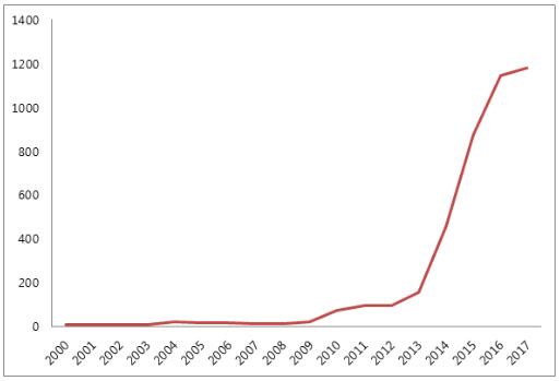 根據(jù)韓國(guó)特許廳的數(shù)據(jù)顯示,截止至2012年,IoT服務(wù)相關(guān)的專利申請(qǐng)量年均不到100件,而在2017年的申請(qǐng)量驟增11倍,達(dá)到了1179件。