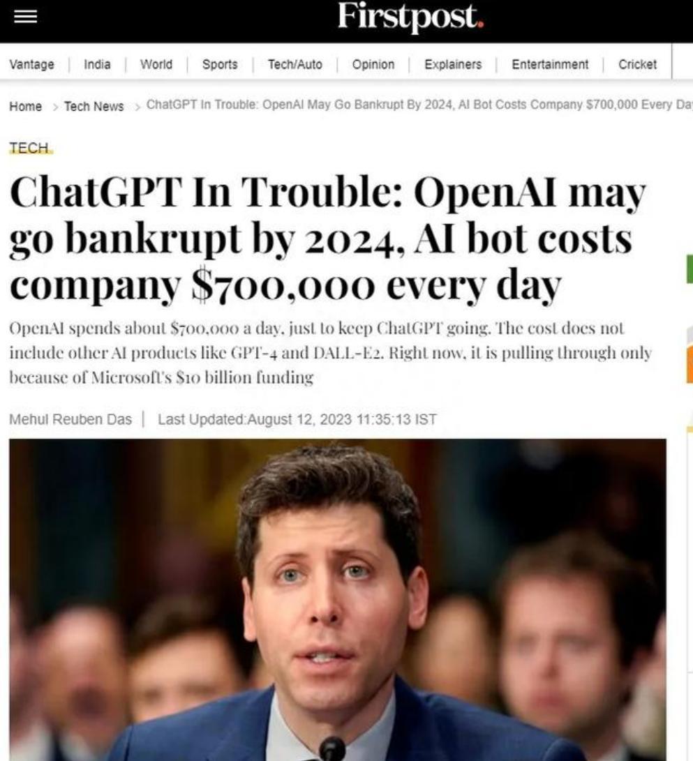 2023 年 1 月,投資銀行摩根士丹利的一份分析報(bào)告稱,在 ChatGPT 上回復(fù)的成本約為谷歌搜索查詢平均成本的 6 倍至 28 倍。根據(jù)摩根士丹利最近的分析,谷歌去年 3.3 萬億次搜索的平均成本約為每次 0.2 美分。因此可以看出,ChatGPT 聊天回復(fù)成本為 1.2 美分至 5.6 美分之間。根據(jù)公開的信息顯示,GPT4 一次完整的訓(xùn)練大約需要 6000 多萬美元,報(bào)道所說的 ChatGPT 每天耗費(fèi) 70 萬美元,應(yīng)該主要是數(shù)據(jù)中心的日常算力消耗。僅在 2022 年 OpenAI 的財(cái)務(wù)凈虧損就高達(dá) 5.45 億美元。甚至有印度媒體聲稱 OpenAI 有在 2024 年倒閉的可能。