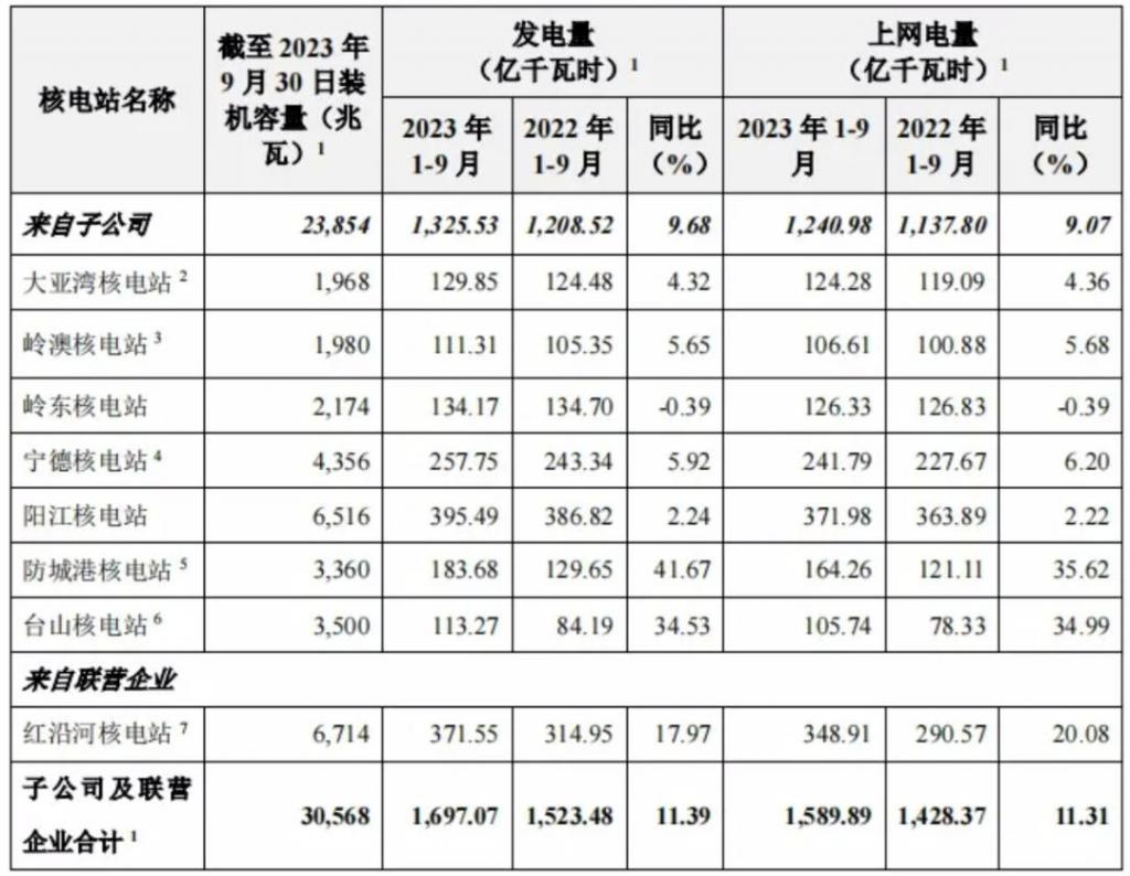 中國廣核是目前國內(nèi)最大的核電公司,目前尚未發(fā)布 2023 年年報(bào),以 2023 年三季報(bào)數(shù)據(jù)來看,截至 2023 年 9 月 30 日,中國廣核總發(fā)電量為 1697.07 億千瓦時(shí),平均到每季度,算上其 11.39% 左右的增幅,2023 年全年發(fā)電量最高不超過 2300 億千瓦時(shí)。