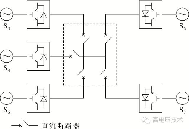 兩端VSC-HVDC系統(tǒng)拓撲結(jié)構(gòu)較為簡單,通過點對點的連接實現(xiàn)有功功率的傳輸。在兩端基礎(chǔ)上發(fā)展而來的多端柔性直流輸電系統(tǒng)(VSC-MTDC),能夠?qū)崿F(xiàn)多電源供電和多落點受電,可以采用不同的拓撲結(jié)構(gòu)形成直流網(wǎng)絡(luò),極大地提高了直流輸電系統(tǒng)的操作靈活性和系統(tǒng)的可靠性。多端直流系統(tǒng)的拓撲可以分為串聯(lián)型和并聯(lián)型,如下圖1-圖4所示,其中并聯(lián)型包括星形拓撲、環(huán)形拓撲和星形-中央環(huán)形拓撲等。