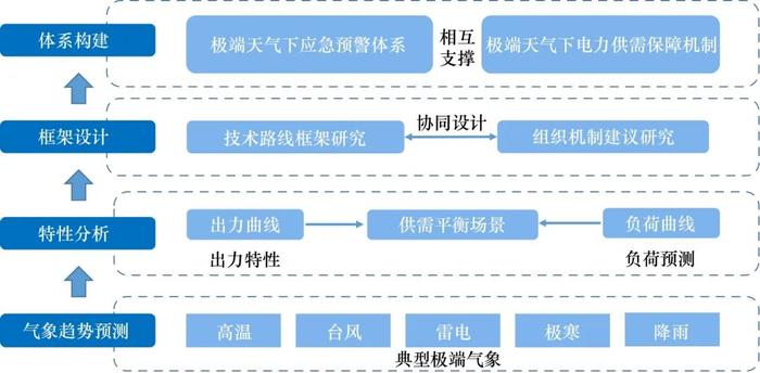新能源出力具有波動(dòng)性,高比例新能源接入的新型電力系統(tǒng),其功率和能量靈活平衡需求顯著提高;極端天氣頻發(fā)趨勢(shì)將進(jìn)一步放大新能源發(fā)電隨機(jī)性及波動(dòng)性對(duì)電力系統(tǒng)安全運(yùn)行的不利影響。針對(duì)全球氣候變暖趨勢(shì),研究我國(guó)大型新能源基地、負(fù)荷中心等送受端地區(qū)的極端氣象特征與演變趨勢(shì),揭示典型極端氣象場(chǎng)景影響電力供給及負(fù)荷需求側(cè)的作用機(jī)理與傳導(dǎo)機(jī)制。結(jié)合高溫、臺(tái)風(fēng)、雷電等極端天氣的歷史事件,新能源的出力特性、負(fù)荷特性,分析極端天氣頻發(fā)條件下的電力供需平衡場(chǎng)景與風(fēng)險(xiǎn);從組織、管理、技術(shù)等維度,形成應(yīng)對(duì)極端氣象的電力供需保障技術(shù)框架與應(yīng)急組織機(jī)制(見圖4)。