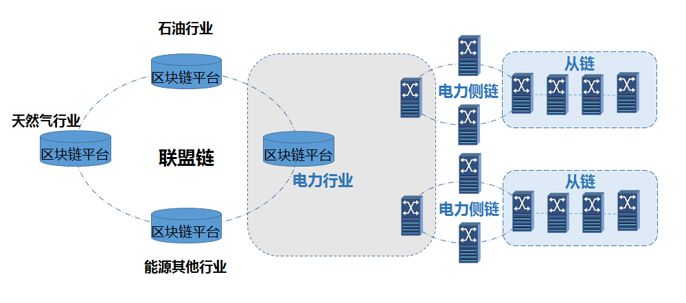 能源區(qū)塊鏈平臺(tái)以聯(lián)盟鏈架構(gòu)為基礎(chǔ),采用“主、側(cè)、從”多鏈混合模式(見(jiàn)圖1),構(gòu)建覆蓋電力、石油、天然氣等各類能源業(yè)務(wù)應(yīng)用的區(qū)塊鏈公共服務(wù)平臺(tái),為能源行業(yè)跨地域、跨企業(yè)的多方協(xié)同與信任傳導(dǎo)提供支撐。
